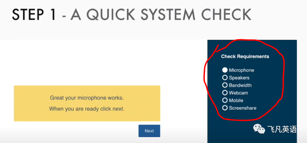 • 考前48小时在插件上完成system check。该检测包括麦克风、扬声器、网络以及摄像头。到此完成STEP 1。