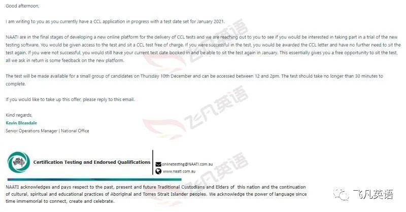 A7: 上图NAATI发给学生的邮件说到,机考试验已到了最后阶段,是势在必行了。至于什么时候开始执行很难说。但鉴于已经进行了试考,没大问题加上系统微调的时间估计明年的考试可能会开始全面实行机考。